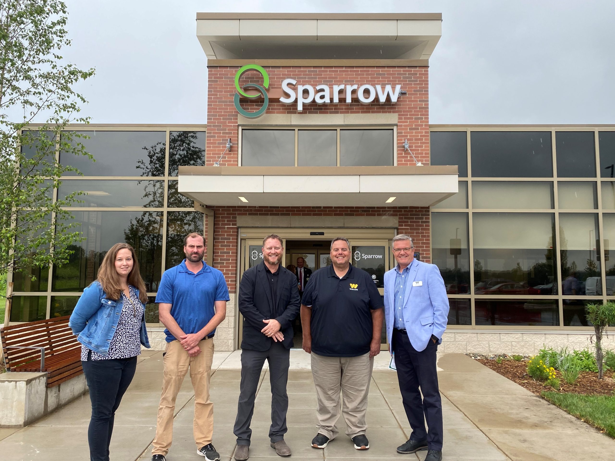It takes a team to complete the projects that WIELAND oversees. Pictured are just a few of the many people that it took to put together the new Sparrow Health Systems medical office building in Portland, MI. Below from left to right is Juanita Pearce (Project Accountant), Chris Miller (Site Superintendent), Matt Getchell (Project Executive), Norman Farhat (Director of Pre-Construction), and Steve Opper (VP-New Business Development). This 11,500 SF building started in September of 2020 and the opening ceremony took place July 13th, 2021.