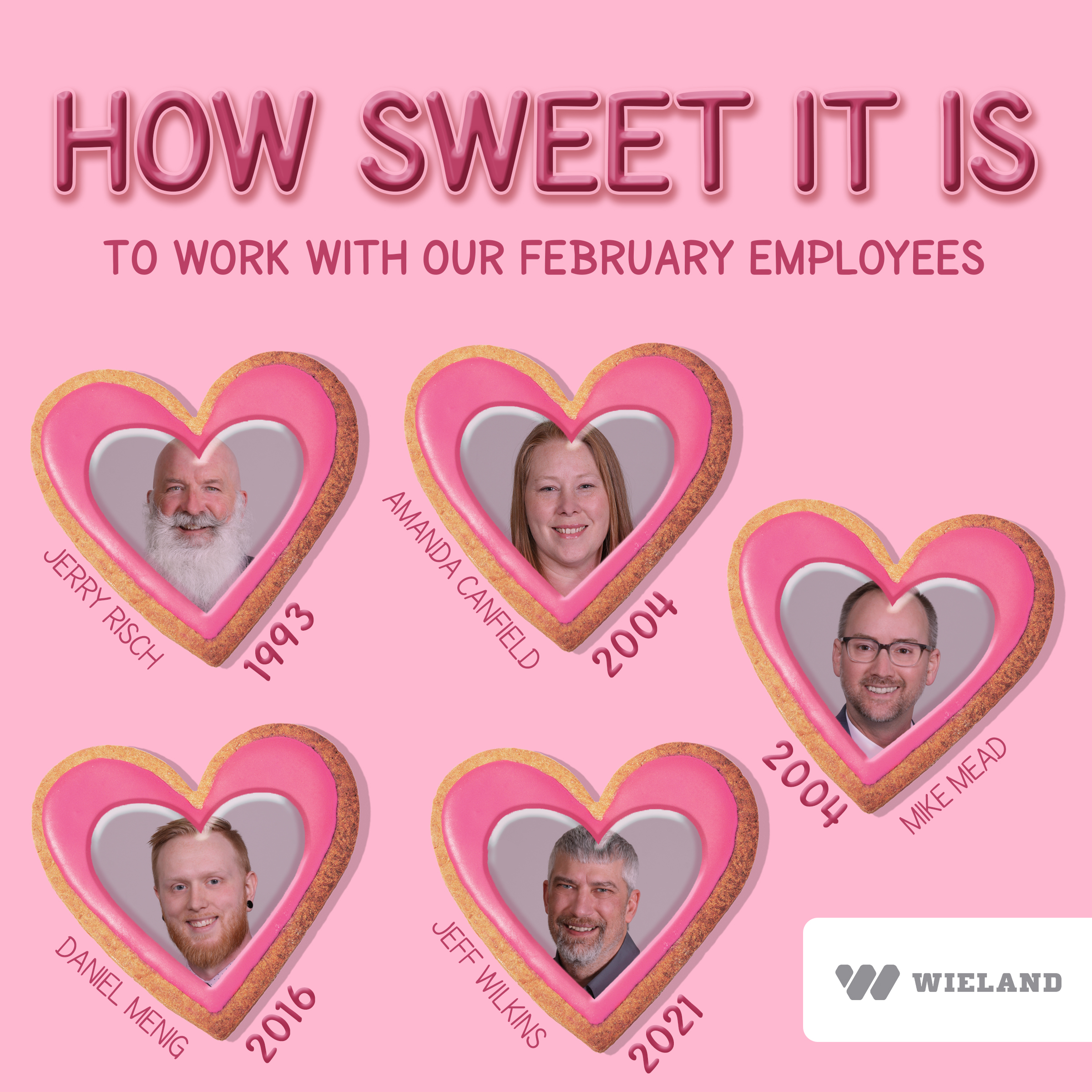 How sweet is it to work with our February employees? WIELAND is proud to congratulate these employees on their milestones: Jerry Risch (1993); Amanda Canfield (2004); Mike Mead (2004); Daniel Menig (2016); Jeff Wilkins (2021). WIELAND would like to thank and congratulate them on their workplace anniversaries! #WIELANDcares