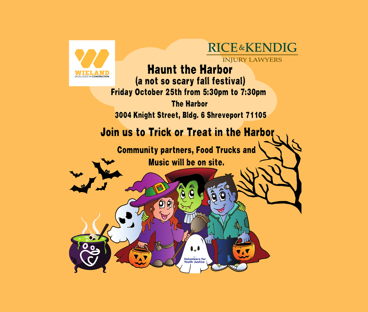 Haunt the Harbor! WIELAND is excited to sponsor and support Volunteers for Youth Justice‘s inaugural Haunt the Harbor fall festival, happening on Friday, October 25, from 5:30 PM to 7:30 PM at The Harbor in Shreveport, LA. This family-friendly event will offer free trick-or-treating and food for the first 500 guests, along with a variety of festive, holiday-themed activities for all attendees.