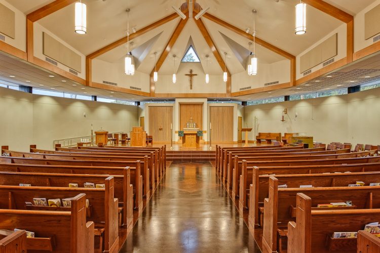 The classic, high-church design provides a vaulted ceiling with natural wood elements and skylights for available daylight. The exterior façade is a mixture of masonry complimented by a bell tower. Wieland implemented the design with great results.